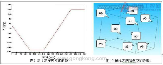4、系統監測:在環境恒溫在25℃。在工作腔內用支架空間分布9個測溫點,溫度傳感器用Pt100;分別在深冷箱內溫度達-180℃和160℃并且保溫20分鐘待工作腔內溫度穩定后開始測溫。其中測溫點的分布如上圖所示:圖2箱體內測溫點空間分布。